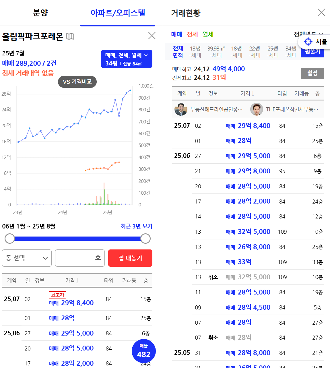 ✔️ 아파트 단지별 호가 vs 실거래가 그래프 제공