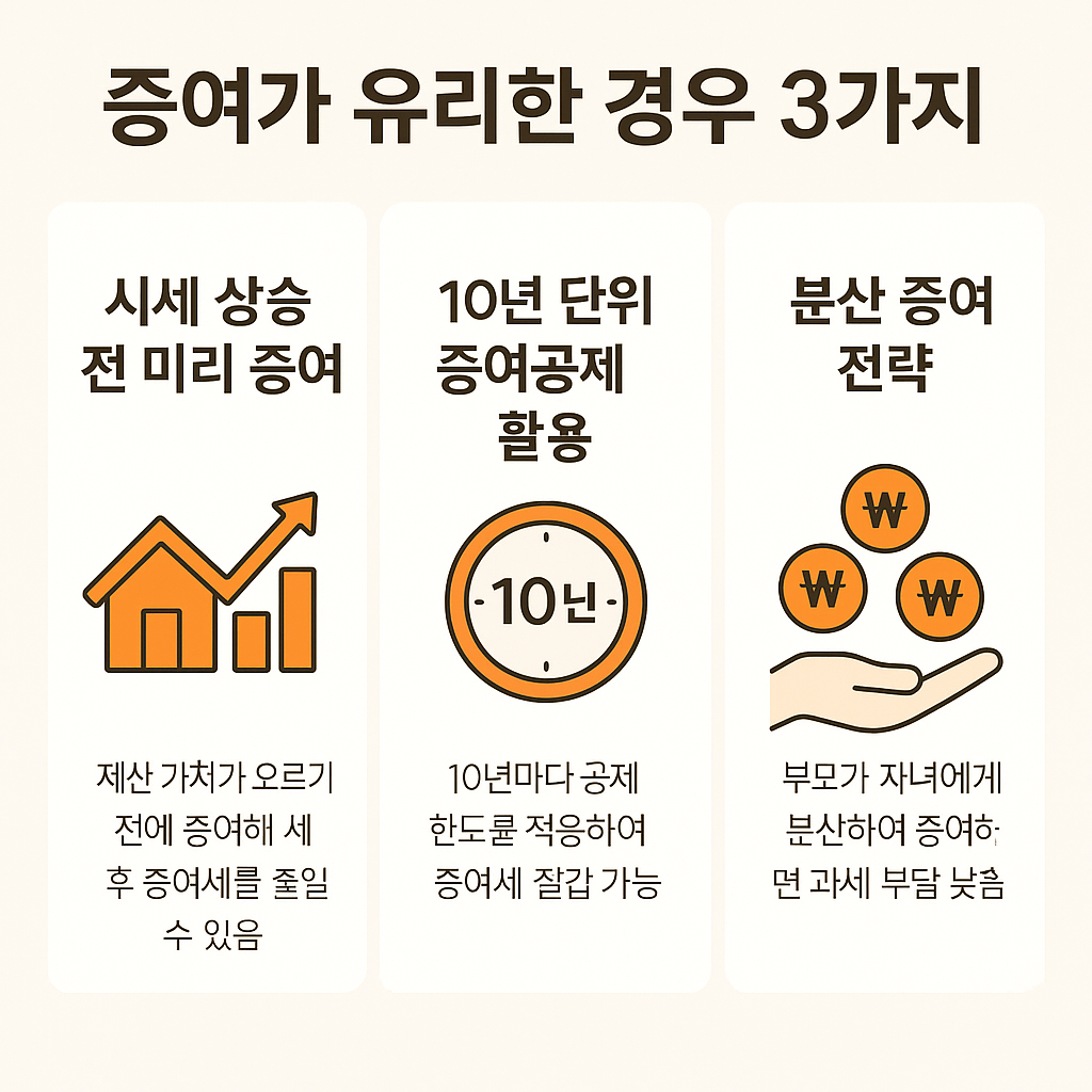 👉 미래 자산 가치 상승이 예상될수록 증여의 메리트가 커집니다.