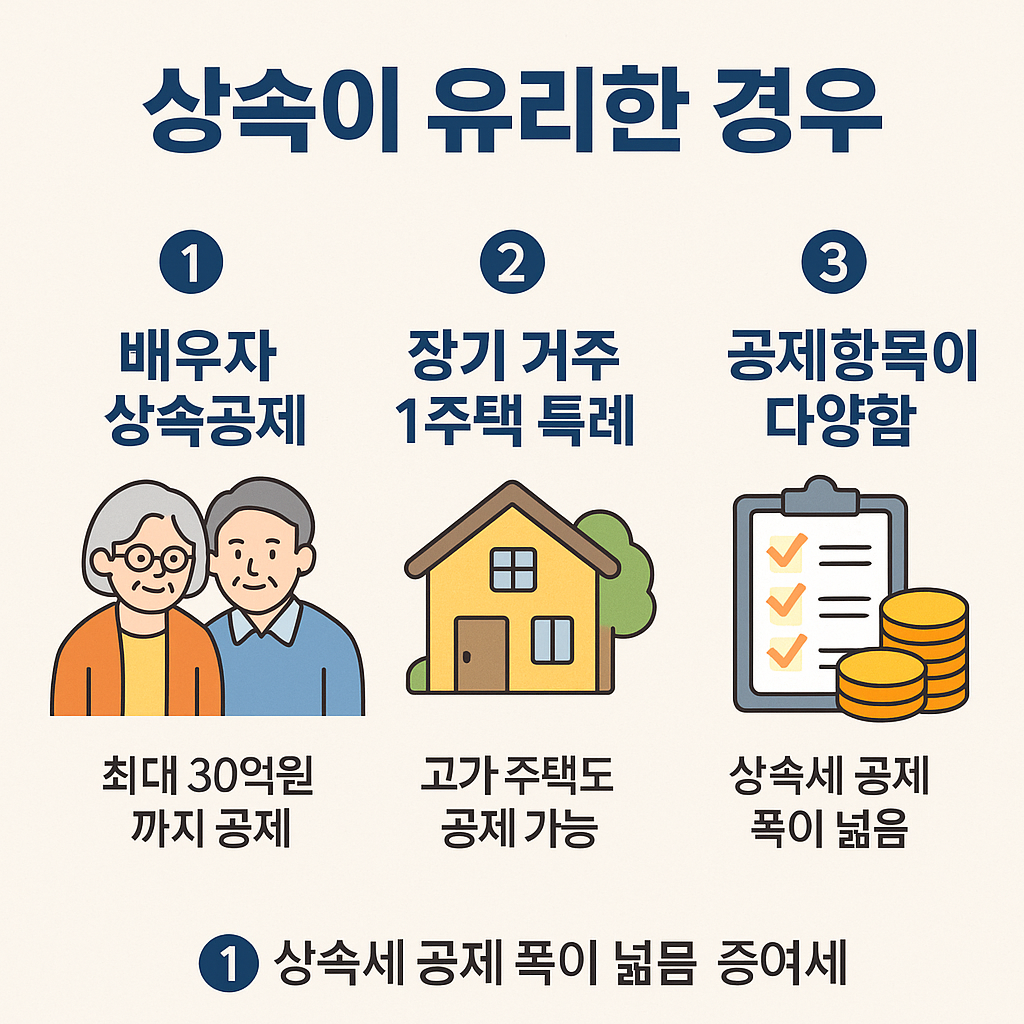 👉 즉, 배우자가 생존해 있고 공제를 충분히 활용할 수 있다면 상속이 더 유리합니다.