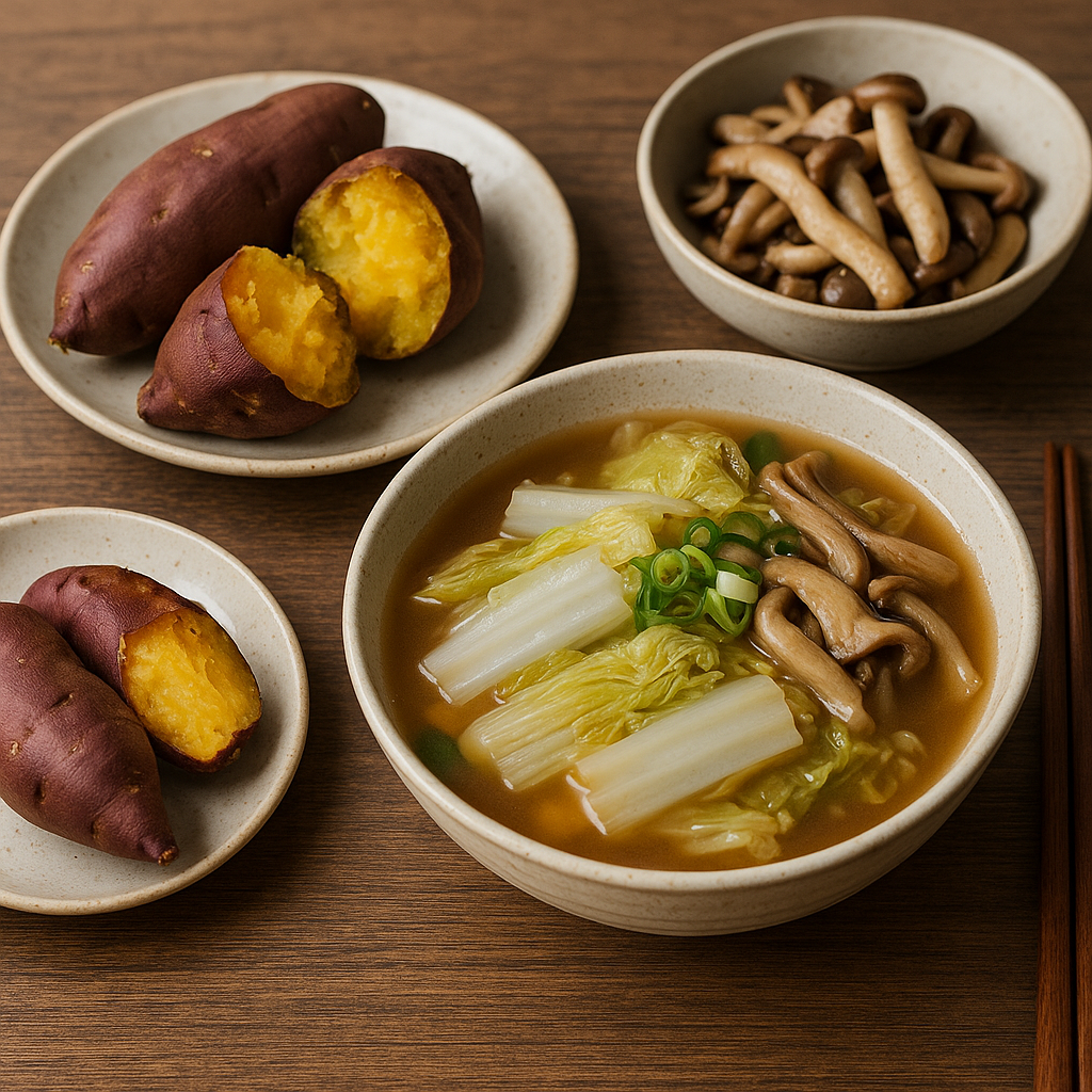 👉 그 역할을 톡톡히 해주는 음식들이 바로 버섯·고구마·배추예요.